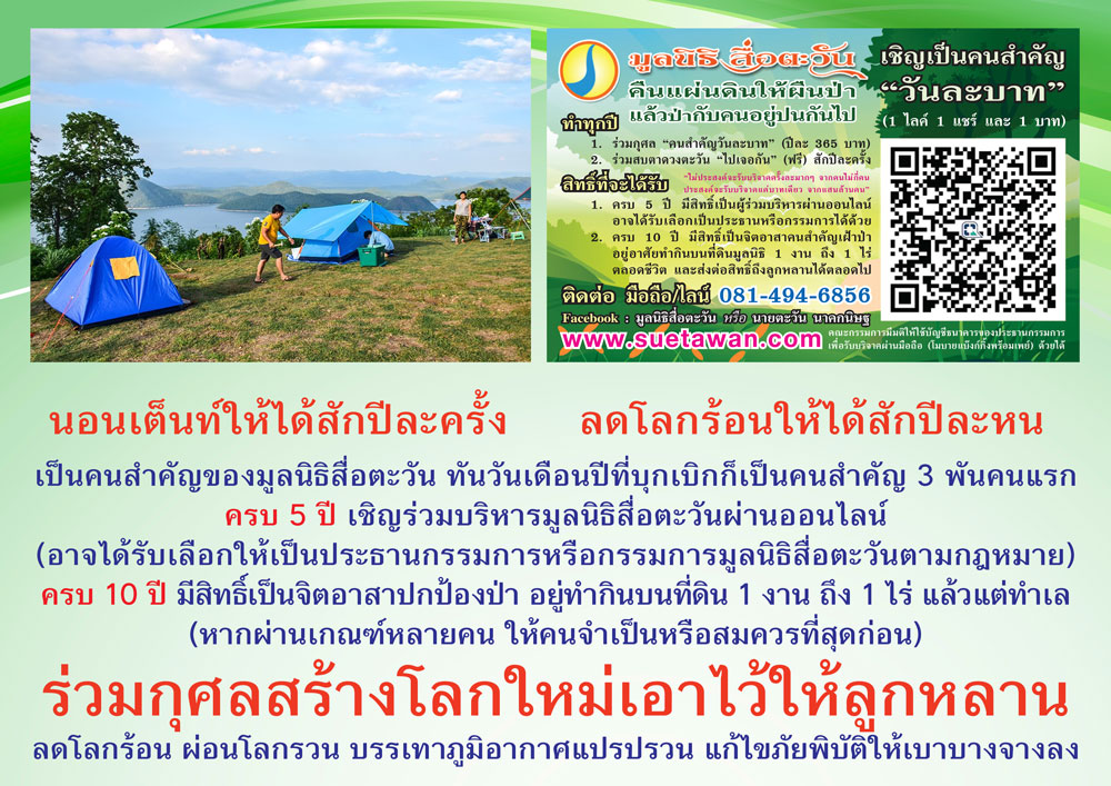 มูลนิธิสื่อตะวัน คืนแผ่นดินให้ป่า แล้วให้ป่ากับคนอยู่ปนกันไป เป็นประโยชน์สุขแก่ทุกชีวิตตราบนิจนิรันดร ไม่รบกวนหรือแม้แต่ก่อความรำคาญแก่ใคร ไม่ตกไปเป็นภาระอนุชนคนรุ่นหลัง