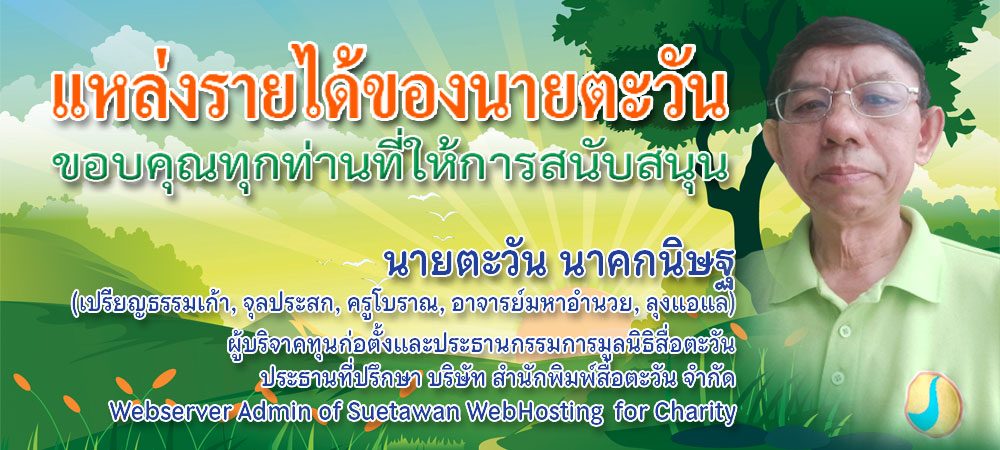 | สื่อตะวัน,มูลนิธิ,คืนแผ่นดินให้ป่า,คืนป่าให้ธรรมชาติ,แจกที่ดิน,ให้ที่อยู่ที่ทำกินไปชั่วลูกหลาน,ร่วมเป็นคนสำคัญวันละบาท,ทำบุญช่วยชาติและกอบกู้โลก |